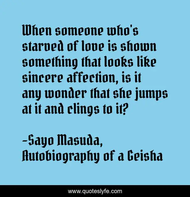 This page presents the quote "When someone who's starved of love is shown something that looks like sincere affection, is it any wonder that she jumps at it and clings to it?". Author of this quote is Sayo Masuda, Autobiography of a Geisha. This quote is about love, affection, geisha, heart-broken, masuda, sayo, japan, sicerity, wonder,.