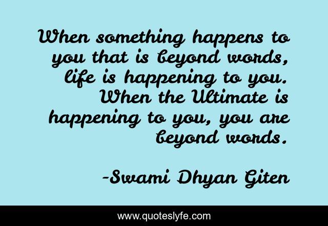 This page presents the quote "When something happens to you that is beyond words, life is happening to you. When the Ultimate is happening to you, you are beyond words.". Author of this quote is Swami Dhyan Giten. This quote is about life, language, insight, spirituality, awareness, words, mysticism, meditation, divine,.