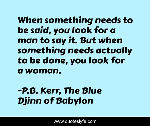 This page presents the quote "When something needs to be said, you look for a man to say it. But when something needs actually to be done, you look for a woman.". Author of this quote is P.B. Kerr, The Blue Djinn of Babylon. This quote is about men, humor, women,.