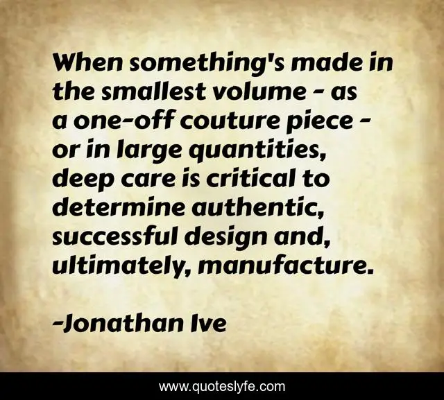 This page presents the quote "When something's made in the smallest volume - as a one-off couture piece - or in large quantities, deep care is critical to determine authentic, successful design and, ultimately, manufacture.". Author of this quote is Jonathan Ive. This quote is about successful, deep, care,.