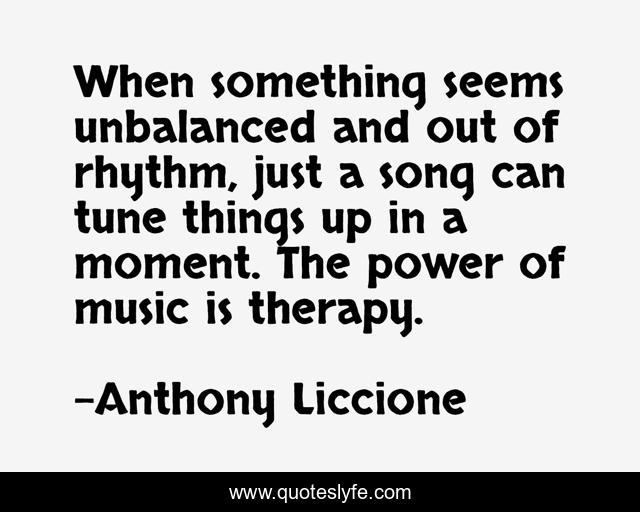 This page presents the quote "When something seems unbalanced and out of rhythm, just a song can tune things up in a moment. The power of music is therapy.". Author of this quote is Anthony Liccione. This quote is about good-mood, power, lyrics, song, instruments, soul, soothe, therapy, sing,.