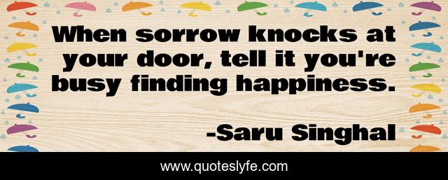 This page presents the quote "When sorrow knocks at your door, tell it you're busy finding happiness.". Author of this quote is Saru Singhal. This quote is about quotes, sorrow, quotes-of-the-day, happiness, quotes-to-define-my-life,.