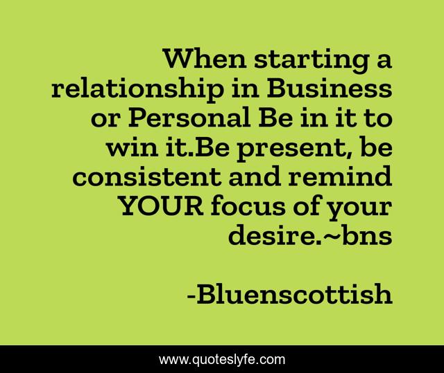 This page presents the quote "When starting a relationship in Business or Personal Be in it to win it.Be present, be consistent and remind YOUR focus of your desire.~bns". Author of this quote is Bluenscottish. This quote is about business, bluenscottish, focus, relationship,.