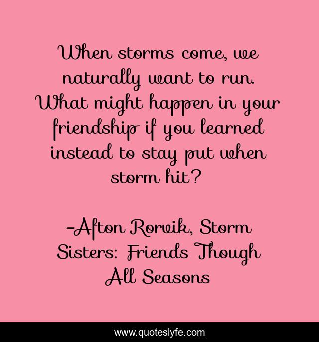 This page presents the quote "When storms come, we naturally want to run. What might happen in your friendship if you learned instead to stay put when storm hit?". Author of this quote is Afton Rorvik, Storm Sisters: Friends Though All Seasons. This quote is about enthusiasm, friendship, storms-of-life, inspirational,.