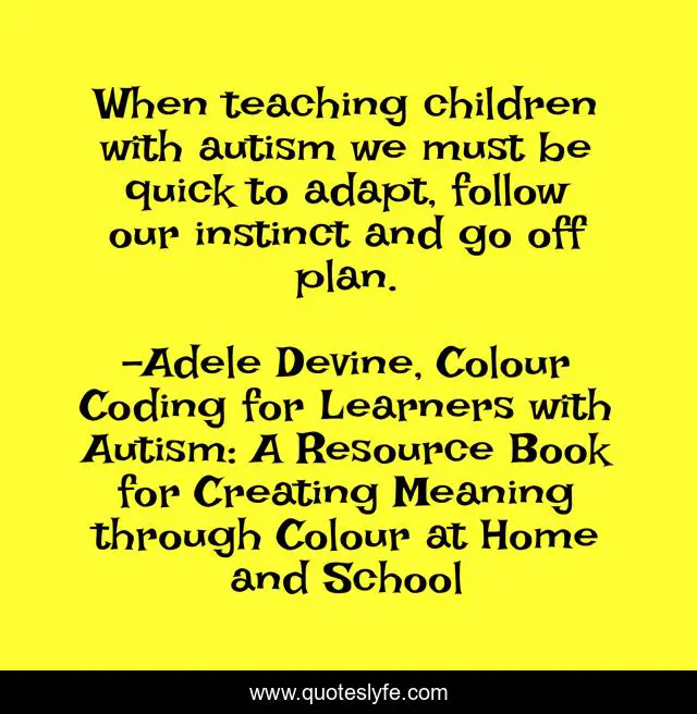 This page presents the quote "When teaching children with autism we must be quick to adapt, follow our instinct and go off plan.". Author of this quote is Adele Devine, Colour Coding for Learners with Autism: A Resource Book for Creating Meaning through Colour at Home and School. This quote is about instinct, teaching, autism, plan,.