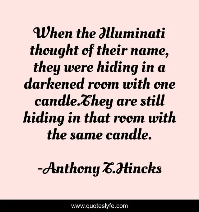 This page presents the quote "When the Illuminati thought of their name, they were hiding in a darkened room with one candle.They are still hiding in that room with the same candle.". Author of this quote is Anthony T.Hincks. This quote is about life, illuminati, secret-societies, philosophy, candle, hiding,.