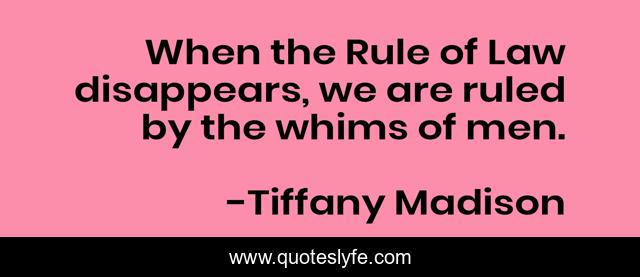 This page presents the quote "When the Rule of Law disappears, we are ruled by the whims of men.". Author of this quote is Tiffany Madison. This quote is about social-psychology, social-norms, police, legal-system, social-change, police-state, men, society-s-increasing-stupidity, america,.
