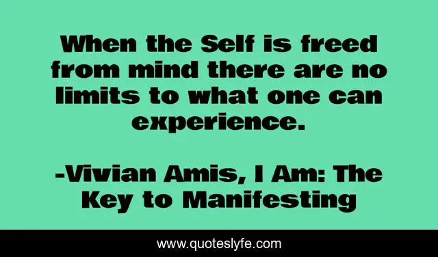 This page presents the quote "When the Self is freed from mind there are no limits to what one can experience.". Author of this quote is Vivian Amis, I Am: The Key to Manifesting. This quote is about i-am, manifesting, enlightenment, love, god, self, peace, mind, oneness,.