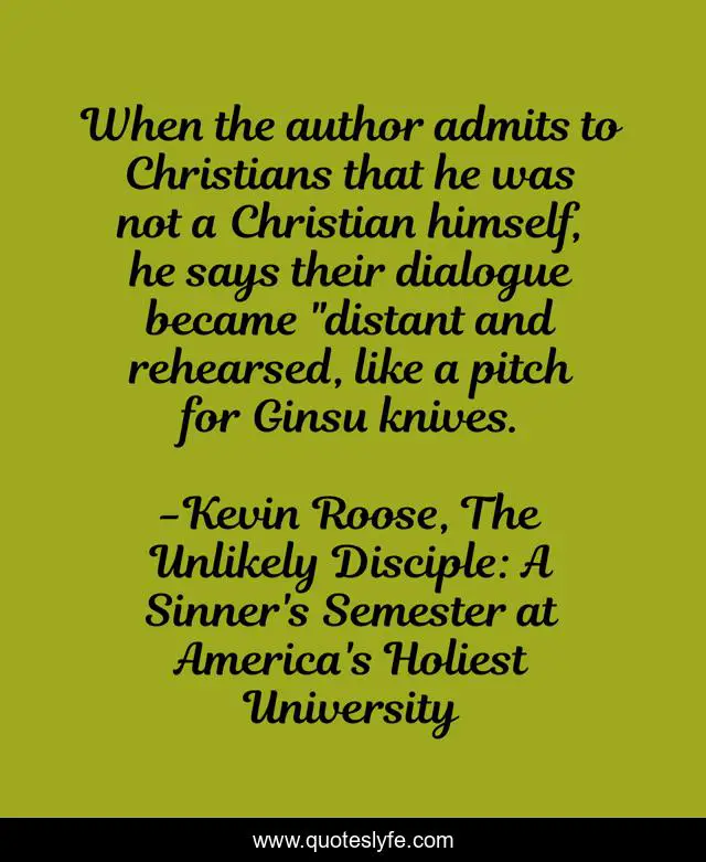 This page presents the quote "When the author admits to Christians that he was not a Christian himself, he says their dialogue became "distant and rehearsed, like a pitch for Ginsu knives.". Author of this quote is Kevin Roose, The Unlikely Disciple: A Sinner's Semester at America's Holiest University. This quote is about evangelism, friendship, witness, authenticity,.