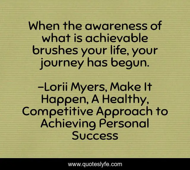 This page presents the quote "When the awareness of what is achievable brushes your life, your journey has begun.". Author of this quote is Lorii Myers, Make It Happen, A Healthy, Competitive Approach to Achieving Personal Success. This quote is about life, lorii-myers, success, make-it-happen, achievement, awareness,.