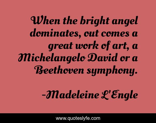 This page presents the quote "When the bright angel dominates, out comes a great work of art, a Michelangelo David or a Beethoven symphony.". Author of this quote is Madeleine L'Engle. This quote is about great, work, angel,.