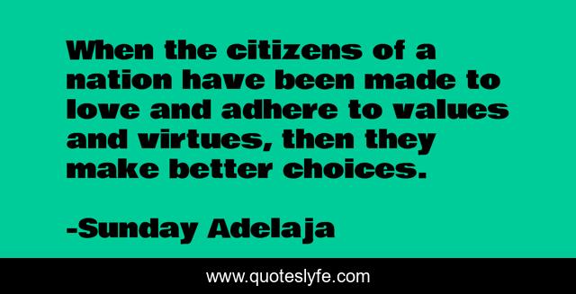 This page presents the quote "When the citizens of a nation have been made to love and adhere to values and virtues, then they make better choices.". Author of this quote is Sunday Adelaja. This quote is about love, citizens, virtues, adhere, values, choices, affection,.
