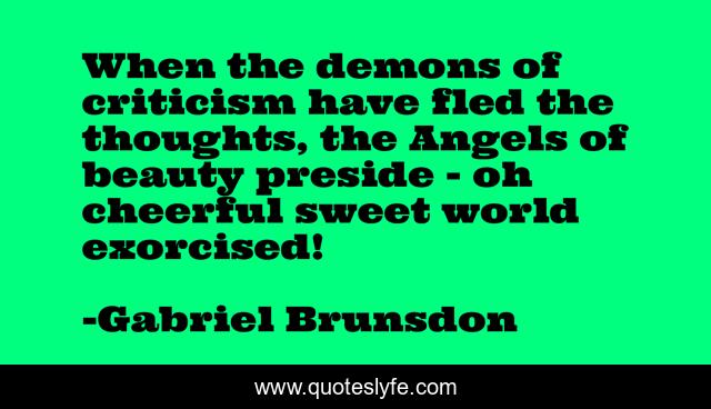 This page presents the quote "When the demons of criticism have fled the thoughts, the Angels of beauty preside - oh cheerful sweet world exorcised!". Author of this quote is Gabriel Brunsdon. This quote is about criticism, beauty, demons, exorcism, world, angels,.