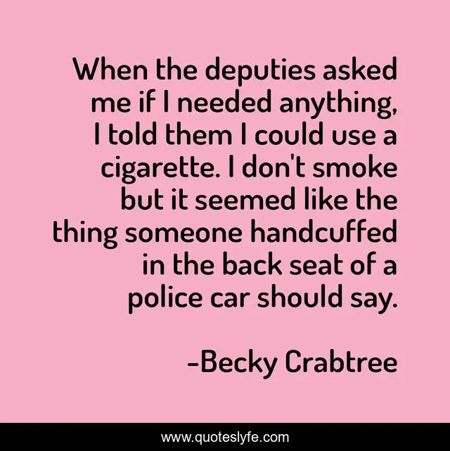 This page presents the quote "When the deputies asked me if I needed anything, I told them I could use a cigarette. I don't smoke but it seemed like the thing someone handcuffed in the back seat of a police car should say.". Author of this quote is Becky Crabtree. This quote is about first-arrest, humorous, tv-influence,.