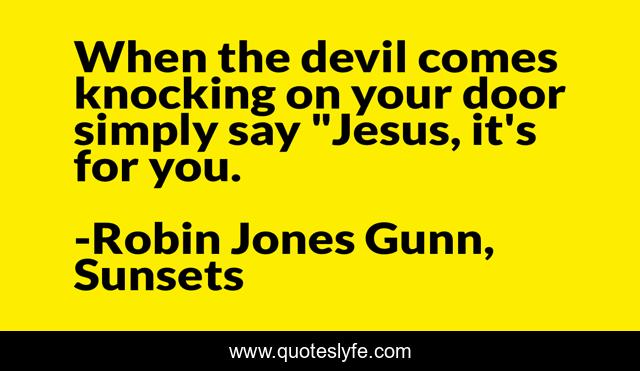 This page presents the quote "When the devil comes knocking on your door simply say "Jesus, it's for you.". Author of this quote is Robin Jones Gunn, Sunsets. This quote is about sunsets, christian, glenbrooke-series, christian-fiction,.