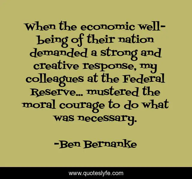 This page presents the quote "When the economic well-being of their nation demanded a strong and creative response, my colleagues at the Federal Reserve... mustered the moral courage to do what was necessary.". Author of this quote is Ben Bernanke. This quote is about strong, well-being, creative,.