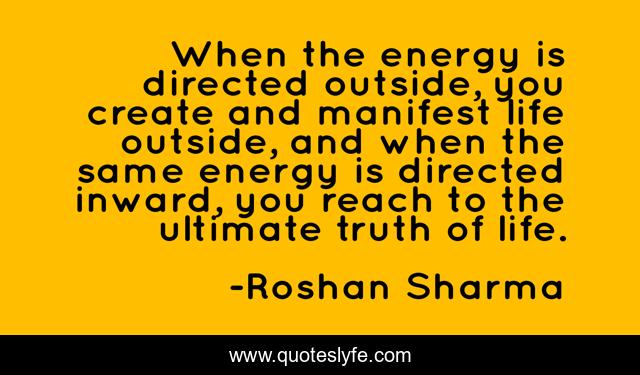 This page presents the quote "When the energy is directed outside, you create and manifest life outside, and when the same energy is directed inward, you reach to the ultimate truth of life.". Author of this quote is Roshan Sharma. This quote is about spiritual-energy, spirituality, new-enlightenment, thought-power, divine-life,.