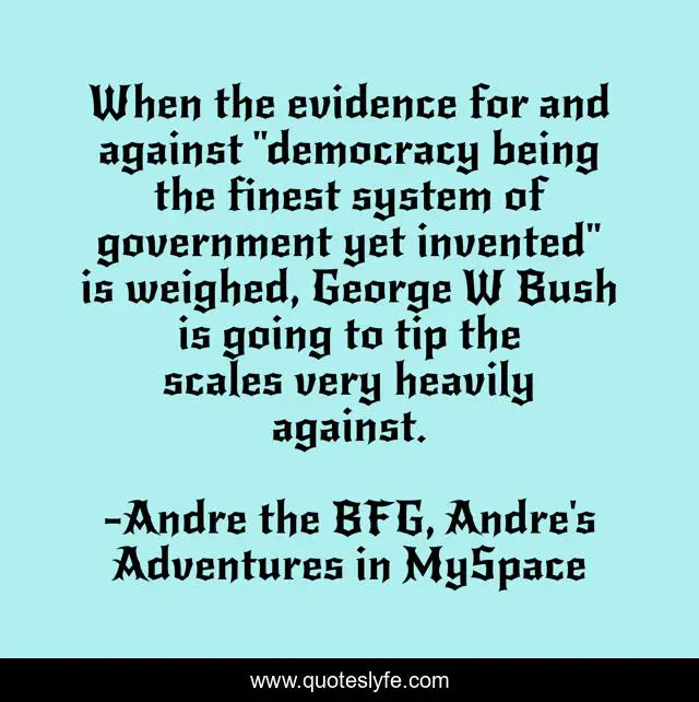 This page presents the quote "When the evidence for and against "democracy being the finest system of government yet invented" is weighed, George W Bush is going to tip the scales very heavily against.". Author of this quote is Andre the BFG, Andre's Adventures in MySpace. This quote is about politics, voting, democracy,.