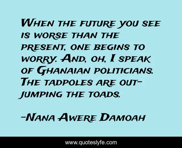This page presents the quote "When the future you see is worse than the present, one begins to worry. And, oh, I speak of Ghanaian politicians. The tadpoles are out-jumping the toads.". Author of this quote is Nana Awere Damoah. .