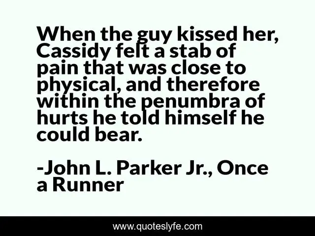 This page presents the quote "When the guy kissed her, Cassidy felt a stab of pain that was close to physical, and therefore within the penumbra of hurts he told himself he could bear.". Author of this quote is John L. Parker Jr., Once a Runner. This quote is about love, acceptance, pain, heartbreak, affection,.