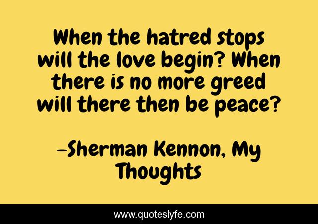 This page presents the quote "When the hatred stops will the love begin? When there is no more greed will there then be peace?". Author of this quote is Sherman Kennon, My Thoughts. This quote is about love, peace, poetry, inspirational, poet, enthusiasm, affection,.