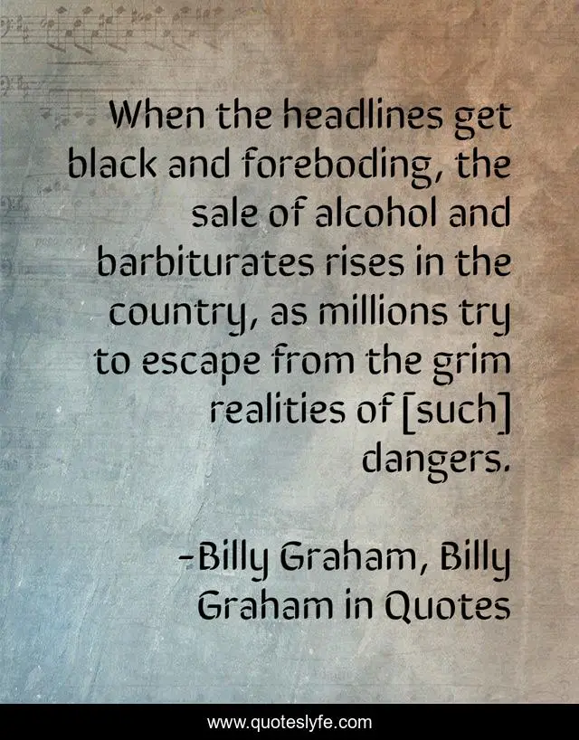 This page presents the quote "When the headlines get black and foreboding, the sale of alcohol and barbiturates rises in the country, as millions try to escape from the grim realities of [such] dangers.". Author of this quote is Billy Graham, Billy Graham in Quotes. This quote is about drugs, addiction, alcohol, billy-graham,.