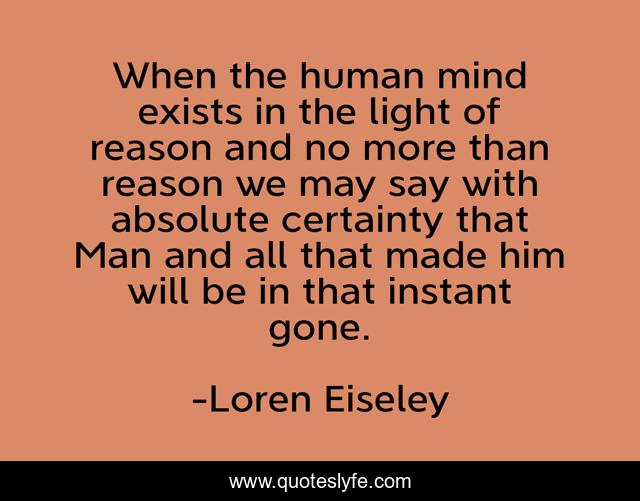 This page presents the quote "When the human mind exists in the light of reason and no more than reason we may say with absolute certainty that Man and all that made him will be in that instant gone.". Author of this quote is Loren Eiseley. .