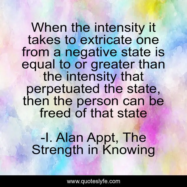 This page presents the quote "When the intensity it takes to extricate one from a negative state is equal to or greater than the intensity that perpetuated the state, then the person can be freed of that state". Author of this quote is I. Alan Appt, The Strength in Knowing. This quote is about spirituality, philosophy, psychology, self-help,.