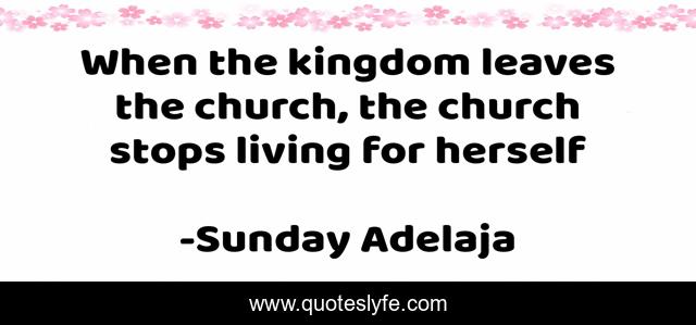 This page presents the quote "When the kingdom leaves the church, the church stops living for herself". Author of this quote is Sunday Adelaja. This quote is about kingdom, herself, church,.