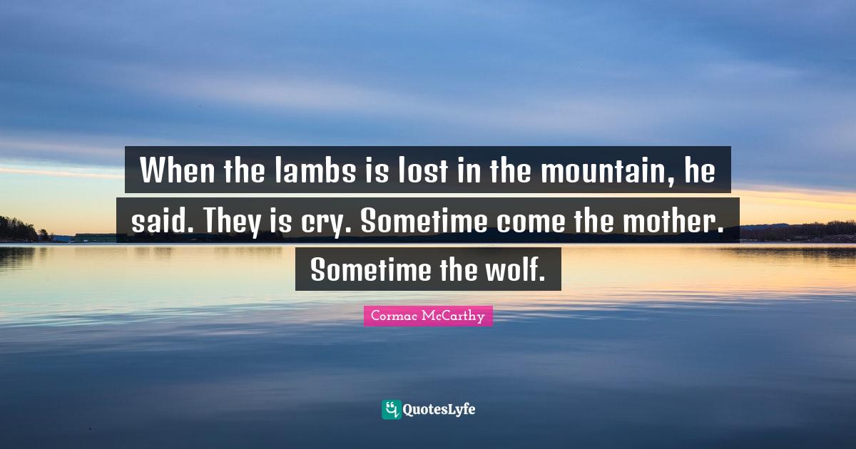 This page presents the quote "When the lambs is lost in the mountain, he said. They is cry. Sometime come the mother. Sometime the wolf.". Author of this quote is Cormac McCarthy. This quote is about mother, lambs, said, mountain, lost, cry,.