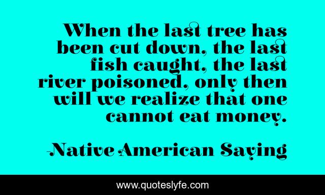 This page presents the quote "When the last tree has been cut down, the last fish caught, the last river poisoned, only then will we realize that one cannot eat money.". Author of this quote is Native American Saying. This quote is about consumerism, last, nature, money, fish, tree, capitalism, environment, cannot-eat,.