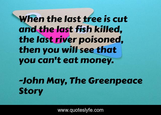 This page presents the quote "When the last tree is cut and the last fish killed, the last river poisoned, then you will see that you can't eat money.". Author of this quote is John May, The Greenpeace Story. This quote is about environment, activism, greenpeace,.
