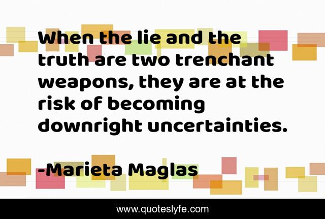 This page presents the quote "When the lie and the truth are two trenchant weapons, they are at the risk of becoming downright uncertainties.". Author of this quote is Marieta Maglas. This quote is about lie, truth, uncertainties,.