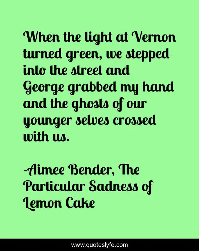 This page presents the quote "When the light at Vernon turned green, we stepped into the street and George grabbed my hand and the ghosts of our younger selves crossed with us.". Author of this quote is Aimee Bender, The Particular Sadness of Lemon Cake. This quote is about past, youth, love, affection, memory,.