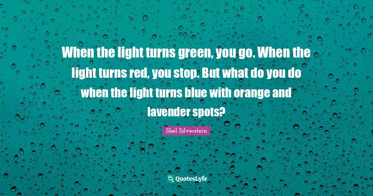 This page presents the quote "When the light turns green, you go. When the light turns red, you stop. But what do you do when the light turns blue with orange and lavender spots?". Author of this quote is Shel Silverstein. This quote is about spots, lavender, red, life, blue, light, turns, green, orange,.