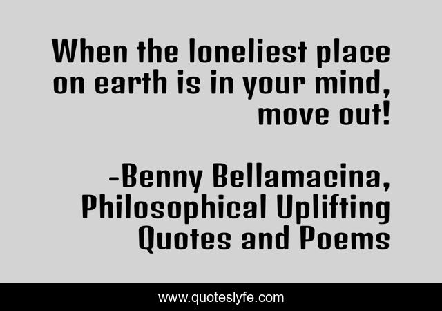 This page presents the quote "When the loneliest place on earth is in your mind, move out!". Author of this quote is Benny Bellamacina, Philosophical Uplifting Quotes and Poems. This quote is about philosophical, mind, wisdom-inspirational, humour,.