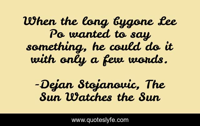 This page presents the quote "When the long bygone Lee Po wanted to say something, he could do it with only a few words.". Author of this quote is Dejan Stojanovic, The Sun Watches the Sun. This quote is about saying, poets, literature, bygone, the-sun-watches-the-sun, sayings, dejan-stojanovic, philosophy, poetry,.