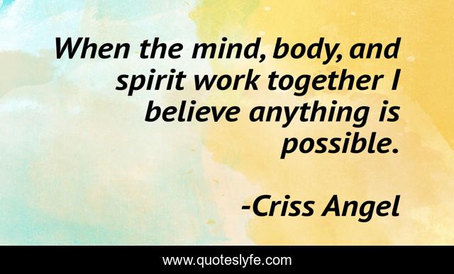 This page presents the quote "When the mind, body, and spirit work together I believe anything is possible.". Author of this quote is Criss Angel. This quote is about criss-angel, magic, angel, criss,.