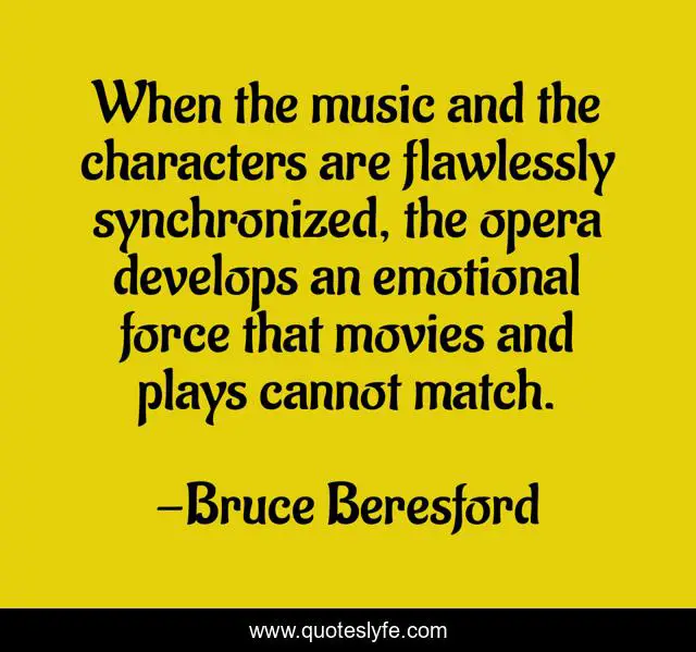 This page presents the quote "When the music and the characters are flawlessly synchronized, the opera develops an emotional force that movies and plays cannot match.". Author of this quote is Bruce Beresford. This quote is about opera, movies, emotional,.