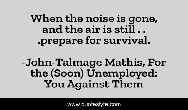 This page presents the quote "When the noise is gone, and the air is still . . .prepare for survival.". Author of this quote is John-Talmage Mathis, For the (Soon) Unemployed: You Against Them. This quote is about preparation, termination, advice,.