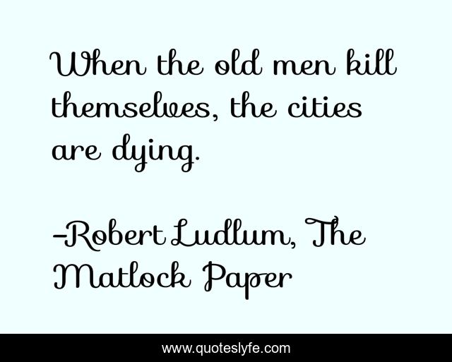 This page presents the quote "When the old men kill themselves, the cities are dying.". Author of this quote is Robert Ludlum, The Matlock Paper. This quote is about cities, kill, dying, old-men,.
