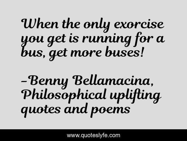 This page presents the quote "When the only exorcise you get is running for a bus, get more buses!". Author of this quote is Benny Bellamacina, Philosophical uplifting quotes and poems. This quote is about england, humour, buses, health, exorcise, humor,.