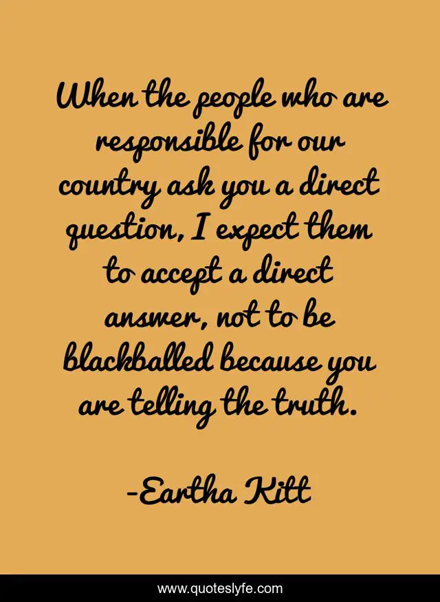 This page presents the quote "When the people who are responsible for our country ask you a direct question, I expect them to accept a direct answer, not to be blackballed because you are telling the truth.". Author of this quote is Eartha Kitt. This quote is about responsible, people,.