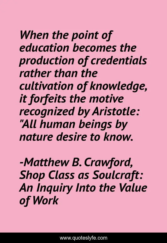 This page presents the quote "When the point of education becomes the production of credentials rather than the cultivation of knowledge, it forfeits the motive recognized by Aristotle: "All human beings by nature desire to know.". Author of this quote is Matthew B. Crawford, Shop Class as Soulcraft: An Inquiry Into the Value of Work. This quote is about college, institutionalization, education, knowledge,.