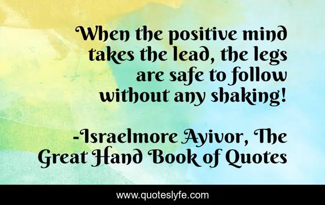This page presents the quote "When the positive mind takes the lead, the legs are safe to follow without any shaking!". Author of this quote is Israelmore Ayivor, The Great Hand Book of Quotes. This quote is about food-for-thought, take-the-lead, takes, positive, positive-leader, safe, mind, positivist, positive-thinking,.