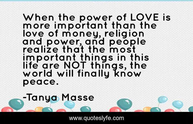 This page presents the quote "When the power of LOVE is more important than the love of money, religion and power, and people realize that the most important things in this life are NOT things, the world will finally know peace.". Author of this quote is Tanya Masse. This quote is about life, love, peace, happiness, remembrance, veterans, affection,.