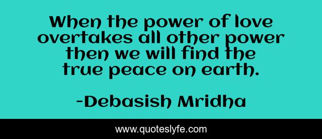 This page presents the quote "When the power of love overtakes all other power then we will find the true peace on earth.". Author of this quote is Debasish Mridha. This quote is about life, love, knowledge, inspirational, intelligence, philosophy, wisdom, quotes, affection,.