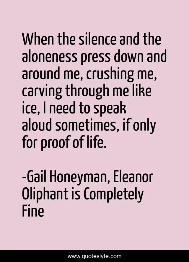 This page presents the quote "When the silence and the aloneness press down and around me, crushing me, carving through me like ice, I need to speak aloud sometimes, if only for proof of life.". Author of this quote is Gail Honeyman, Eleanor Oliphant is Completely Fine. This quote is about coping, loneliness, solitude, loneliness-of-life,.