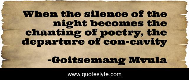 This page presents the quote "When the silence of the night becomes the chanting of poetry, the departure of con-cavity". Author of this quote is Goitsemang Mvula. This quote is about endurance, poetry, silence, night,.