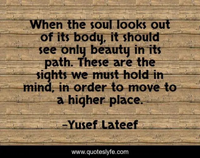This page presents the quote "When the soul looks out of its body, it should see only beauty in its path. These are the sights we must hold in mind, in order to move to a higher place.". Author of this quote is Yusef Lateef. This quote is about path, mind, soul,.